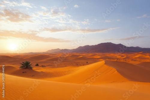 Sunrise over golden sand dunes with a lone palm and distant mountains, serene and vast desert landscape