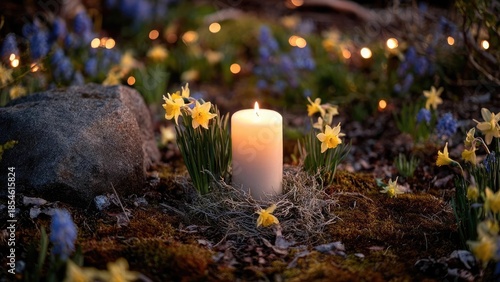 A lit white candle sits in a mossy garden bed surrounded by yellow daffodils and blue flowers, with warm bokeh lights in the background Concept Candlelit garden scene, Daffodils and blue blooms