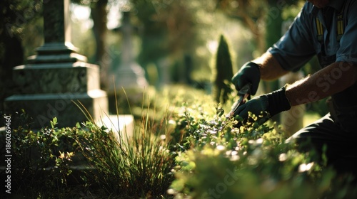 Medium shot capturing a gardener trimming overgrown bushes and grass edges at a grave site emphasizing attentive detail in cemetery upkeep.