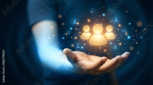 a glowing hand gently cradles a network of illuminated human figures representing connection community and the power of digital interactions in a modern