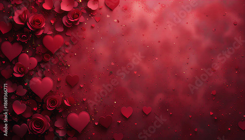Czerwone tło walentynkowe z sercami i różami, romantyczna kompozycja z miejscem na tekst, elegancki design na Dzień Zakochanych.