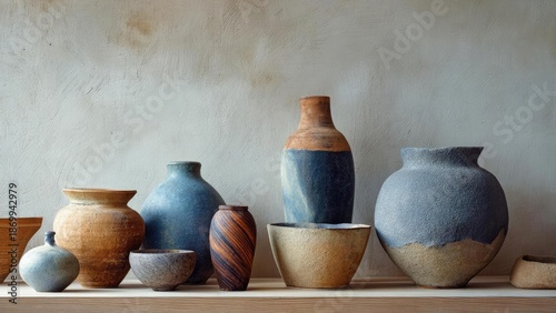 Assorted ceramic vases and bowls in blue and earthy tones arranged on a wooden shelf. Concept Ceramic Vases, Blue and Earth Tones, Wooden Shelf Display, Clay Bowls, Rustic Table Decor
