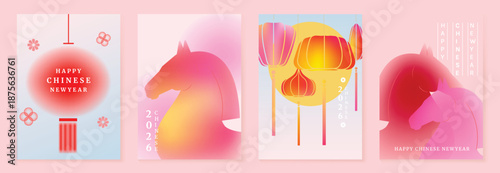 Happy Chinese New Year 2026 Year of the Horse greeting card vector set with gradient red lanterns and zodiac horse illustration. Modern festive design for posters and invitations.