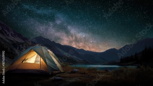Illuminated camping tent under a clear night sky with milky way and mountains. Adventure and travel concept for outdoor lifestyle.