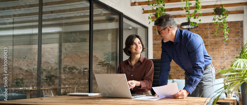 Happy busy executive leader working with colleague using laptop computer in office. Two professionals team people man and woman business partners talking on financial results at corporate meeting.