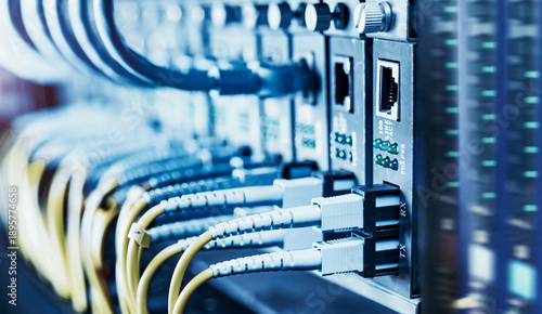 Fiber Optical cables connected to an optic ports and Network cables connected to ethernet ports