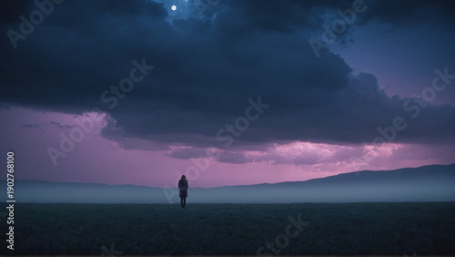 Silhueta de mulher solitária num campo ao entardecer sob céu dramático e lua cheia. Estética surreal em tons de roxo e azul.