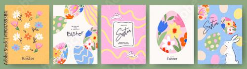 Happy Easter set of greeting cards, posters, holiday covers. Trendy design templates with typography, hand drawn Easter eggs and bunny, spring flowers, polka dots and stripes in pastel colors.
