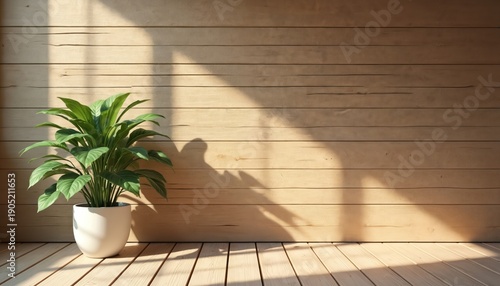 Potted green plant sits on light wood floor in front of wood paneled wall. Sunlight casts shadows creating serene indoor atmosphere. Minimalist decor.