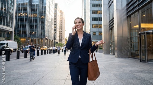 Successful businesswoman walking city street talking on mobile phone. Professional female executive suit. Corporate lifestyle communication concept. Urban success. Happy entrepreneur.