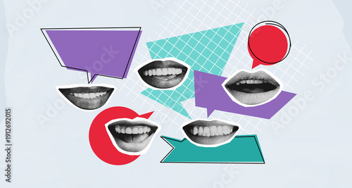 Collage of speech bubbles and smiling mouths on abstract background representing communication and conversation concept in business and creative setting.