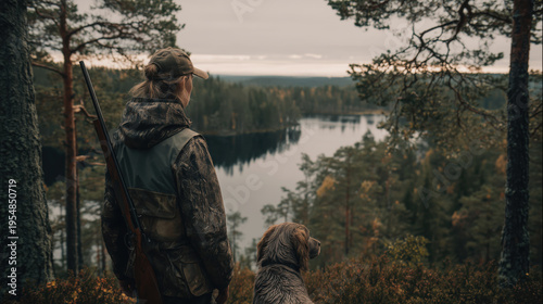 Hunter with a dog standing on a cliff overlooking a forest lake in Sweden.