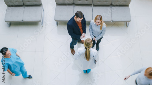 High Angle Shot in the Hospital Lobby, Young Couple Talks Meets with Female Physician / Doctor / Nurse, they have Discussion. New, Clean, Modern Hospital with Friendly and Professional Personnel.