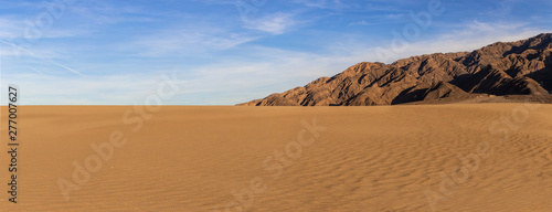 Sand dunes in a desert landscape in Death Valley California. The vast barren land is dry and arid due to droughts result of global warming and climate change.