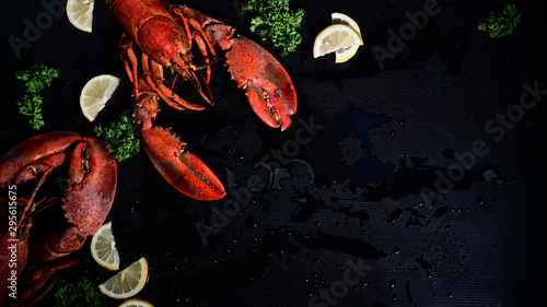 Above shot two lobster with lemon and parsley, Copy space dark background.