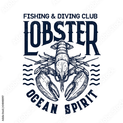 T-shirt print with lobster. Vector mascot for diving and fishing sea adventure club. Scuba dive nautic grunge marine crustacean t-shirt emblem. Ocean sport team apparel template design with lobster
