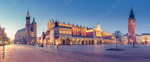Krakow, Poland, main square night panorama with Cloth Hall and St Mary's church