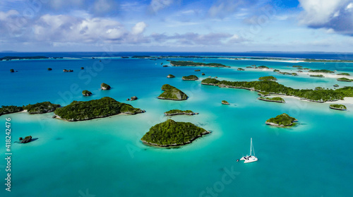 A spectacular drone image over Falaga Island in the lower Lau Group, Fiji showing a catamaran peacefully at anchor.
