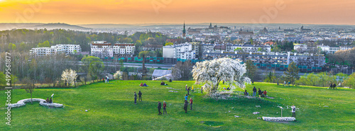 Widok na Kraków, panorama miasta z Kopca Krakusa, kwitnące drzewo śliwki