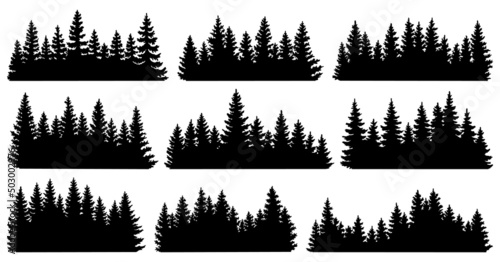 Fir trees silhouettes. Coniferous spruce horizontal background patterns, black evergreen woods vector illustration. Beautiful hand drawn panorama with treetops forest