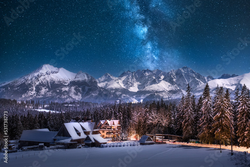 The Milky Way over the Tatras. Winter, mountain panorama, night. Poland, Zgorzelisko Clearing. Droga mleczna nad Tatrami. Zima, panorama gór, noc. Polska. Polana Zgorzelisko.