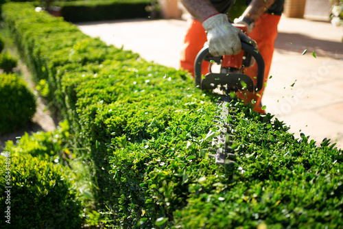 Home and garden concept. Hedge trimmer in action. Shrub trimming work.