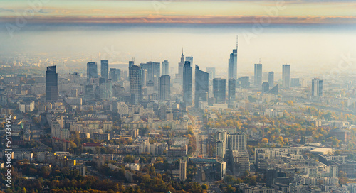 Stunning aerial view of downtown Warsaw from plane window. Autumn morning. Sunrise with fog over the city. Modern skyscrapers. High quality photo