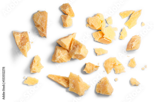 Hard mature cheese (Parmesan, Parmigiano), rough pieces top view isolated png