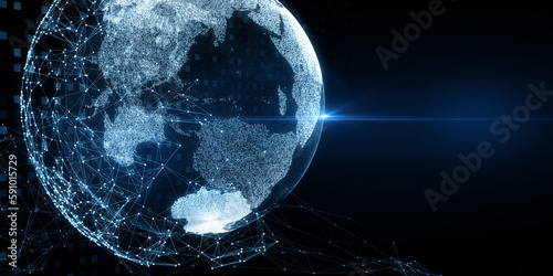 Glowing blue polygonal globe hologram on dark backdrop. 3D Rendering.