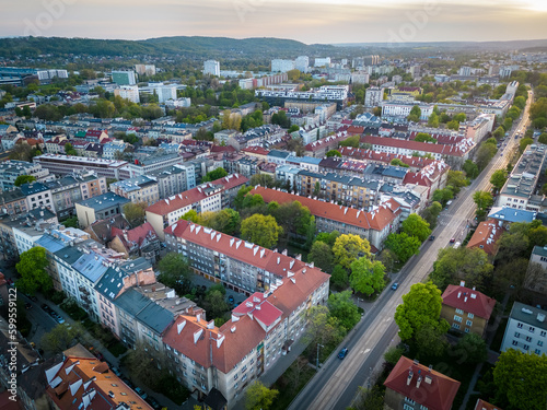 Widok na miasto z lotu ptaka, zachód Słońca, Kraków Krowodrza.