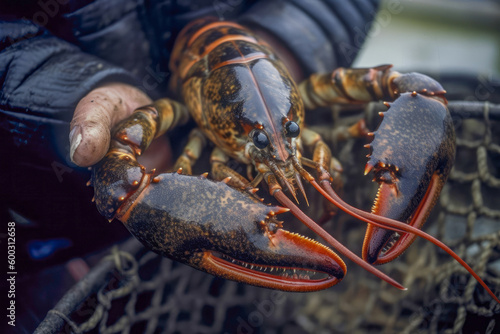 Close-up of a lobster being harvested from a trap. Generative AI.