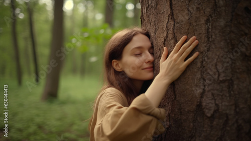 Young woman tree hugging in the forest in concept of people love nature and tree to protect from deforestation and pollution or climate change