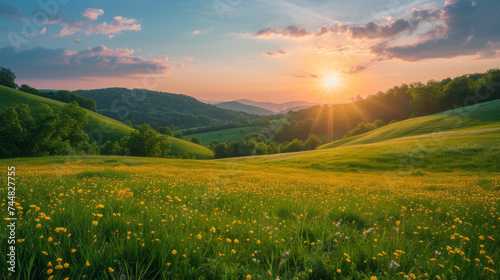 Picturesque colorful summer landscape with warm sunset lighting. A meadow with yellow wildflowers in the foreground, forested hills and evening sky in the background.