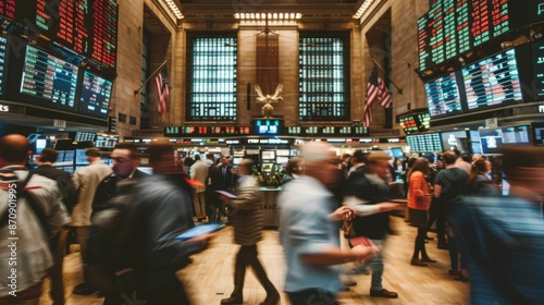 Blurred motion of traders and investors on a bustling stock exchange trading floor with numerous digital displays.