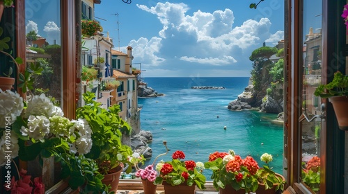 A beautiful view of the sea from an open window with flowers and potted plants. There are also buildings on one side