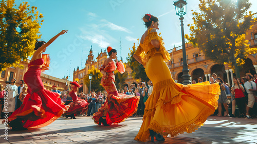 Colorful costumes, passionate expressions, intricate footwork - a lively flamenco dance performance in Seville.