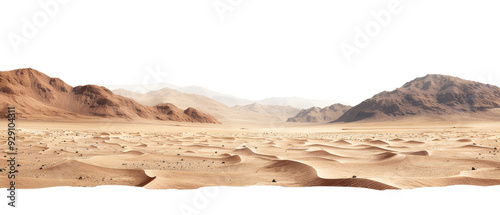 A vast desert landscape with rolling sand dunes and distant mountains, isolated on white background, transparent background.