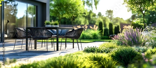 Modern patio furniture nestled in a lush green garden with vibrant purple flowers