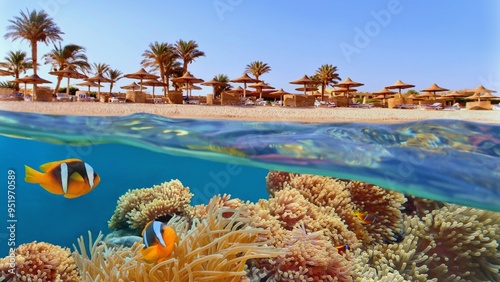 Tropical coral reef and clown fish with beach with palms and sun umbrelas on the background, Red Sea, Egypt