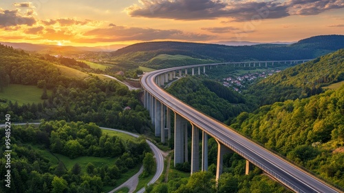 An overhead picture of a motorway bridge that connects towns at dusk, spanning a valley with verdant hills and forests as part of infrastructure development