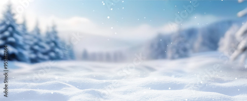 Beautiful winter background of snow and blurred forest in background, Gently falling snow flakes against blue sky. Wide panorama format.