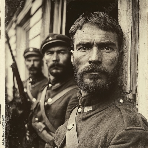 Three soldiers from the First World War stand in a doorway displaying their weapons with serious expressions highlighting the gravity of their duty during this historic conflict.