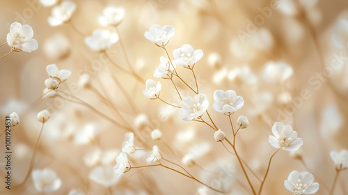 Delikatne, suche białe kwiaty o subtelnych płatkach tworzą eteryczny, lekki obraz. Ich kruche, drobne formy w makro ujawniają misterną strukturę, nadając całej kompozycji delikatności i piękna.
