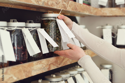 Biała herbata .Kobieta wybiera rodzaj herbaty podczas zakupów w sklepie herbacianym