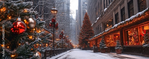 Christmas lights and decorations transforming city street during snowfall