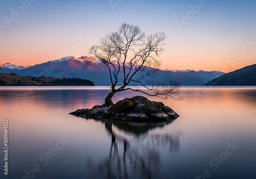 The iconic wanaka tree stands in the lake at sunset in new zealand