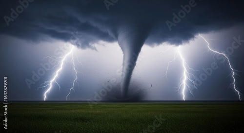 A catastrophic supercell storm with a massive tornado and multiple lightning bolts over a green landscape.