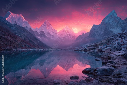 Majestic Himalayan peaks reflected in a tranquil lake at vibrant sunset