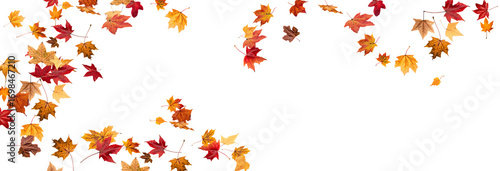 Falling leaves, autumn foliage on transparent background, beautiful background of orange and gold leaves. Vector maple leaf, png, flying foliage from tree.