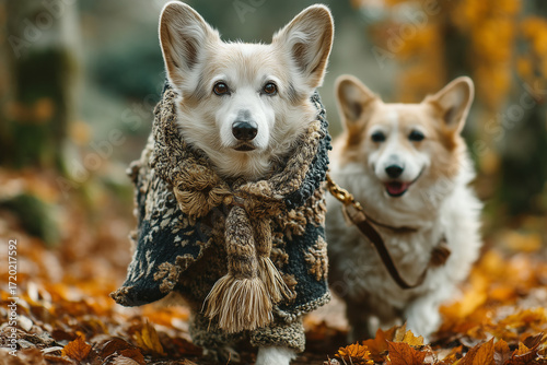 Pieski rasy corgi ubrane w śmieszne szaty – humorystyczna scena